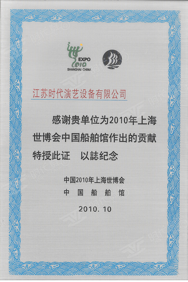 2010年上海世博會(huì)中國(guó)船舶館貢獻(xiàn)證書